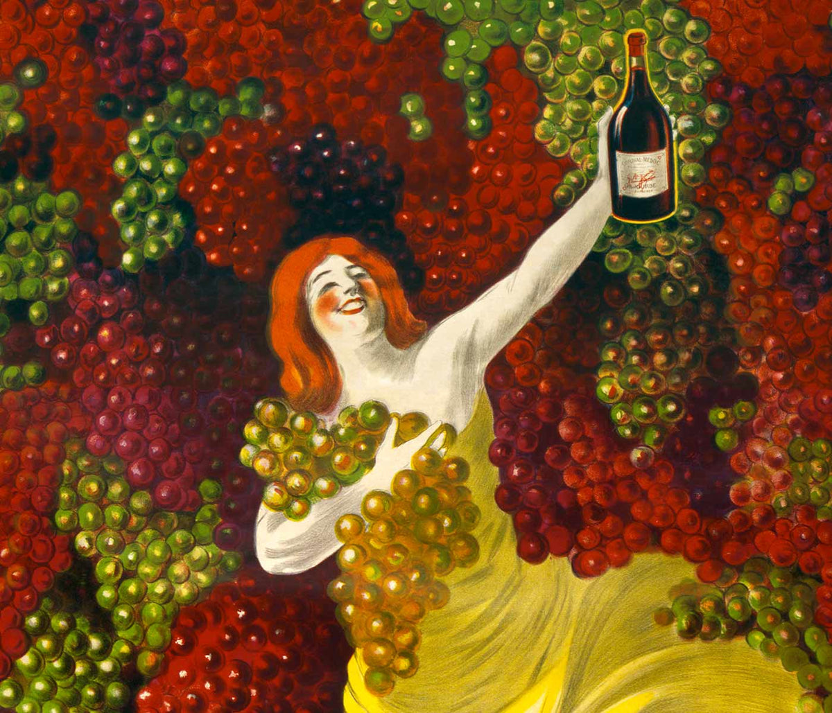 Leonetto Cappiello · 1907 · poster joyeux de liqueur avec danseuse vêtue de jaune et grappes de raisin tombantes