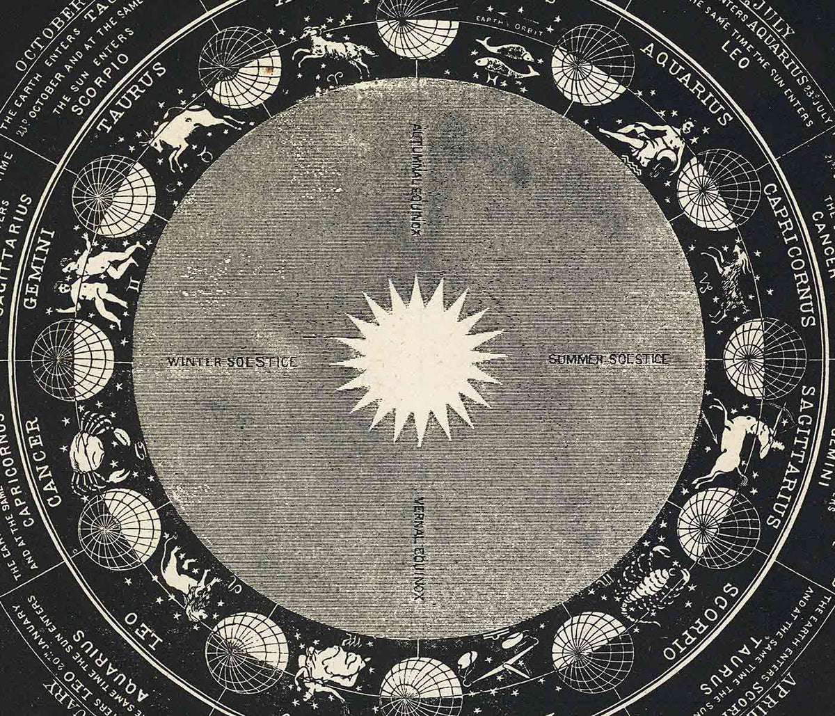 Asa Smith · 1850 · Impression de carte du zodiaque détaillée associant emblèmes des constellations et trait victorien net