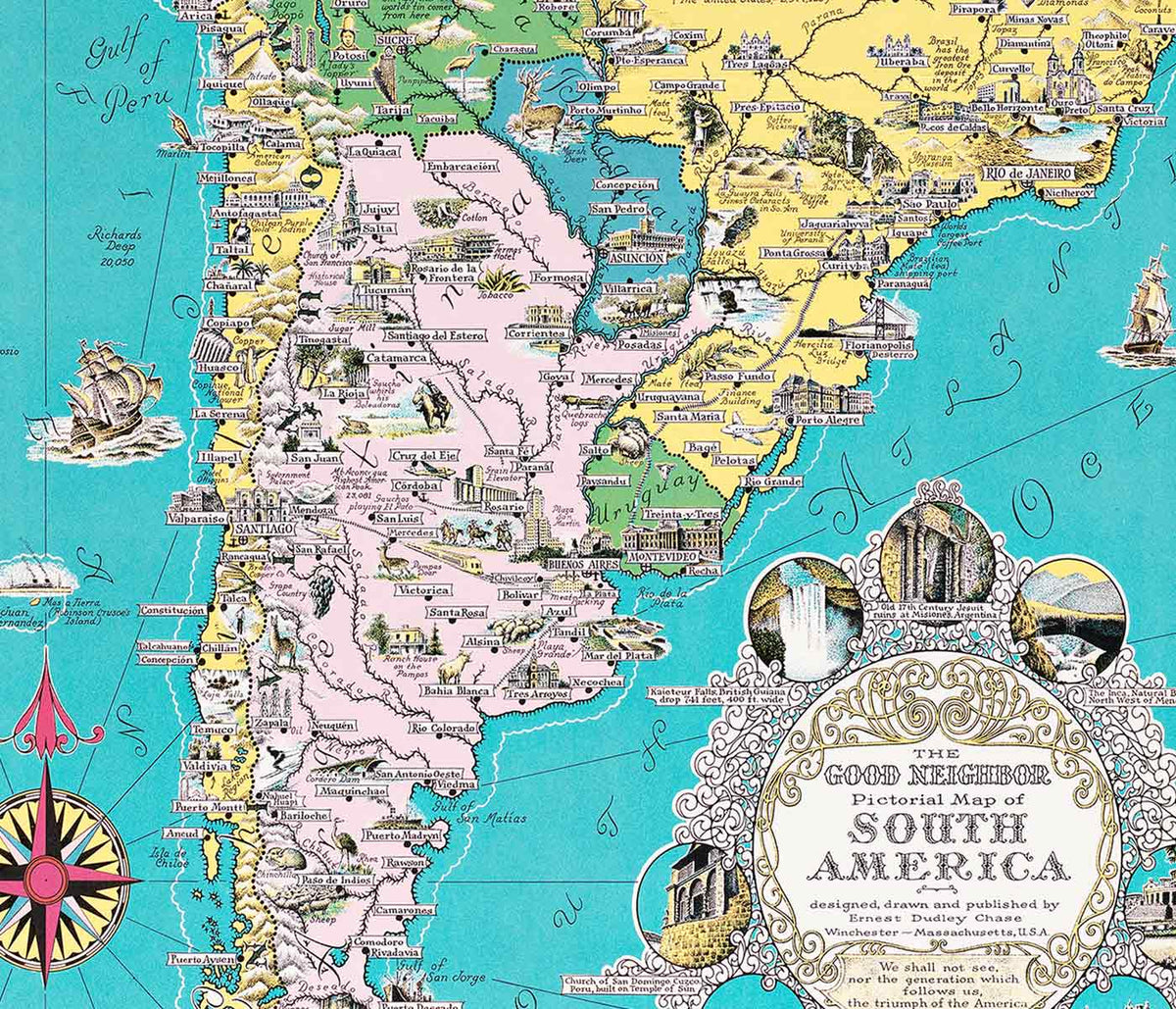 Ernest Dudley Chase · 1935 · Poster carte illustrée d'Amérique du Sud lumineuse avec animaux, monuments et routes maritimes